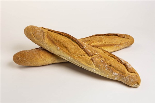 Barra de pan con 15% de masa madre cocida en horno de piedra y hecha a base de una mezcla de harinas de trigo y centeno