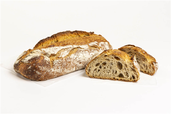 Pan de masa madre de larga fermentación de miga prieta y sabor intenso con ligero toque de acidez por la masa madre y de corteza fina y crujiente (Cumple con la legislación española del pan de Masa Madre)