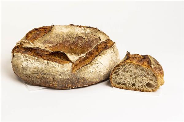 Rosca tradicional en forma de corona con corteza muy crujiente y miga húmeda con profundo sabor a cereal. Pan de larga fermentación con masa madre