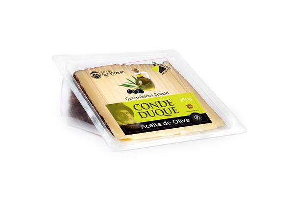 QUESO CURADO CON ACEITE DE OLIVA VIRGEN EXTRA ELABORADO CON LECHE CRUDA DE MEZCLA DE VACA, OVEJA Y CABRA, ENVASADO EN CUÑA PRECORTADA 250 G
