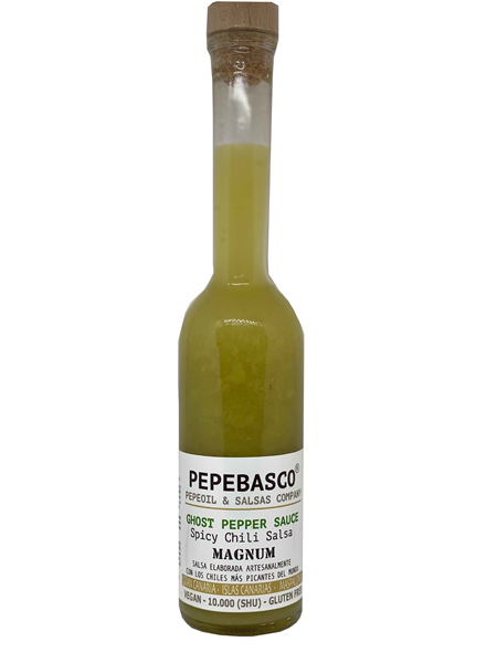 Hecho a partir de nuestros pimientos frescos, verdes o rojos, 100%natural, sin conservantes, colorantes ni aglutinantes. Pepebasco es una fórmula maestra hecha a partir de nuestros famosos ghost peppers cultivados de forma ecológica y mimados hasta el momento de su recolección.Elaboramos todas las salsas artesanalmente.Ingredientes: Vinagre de vino blanco, agua, ghost pepper sal y maicena.