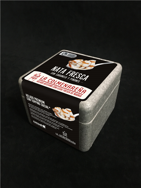 Helado elaborado con leche fresca y nata fresca, presentado en envase de porexpán de 500 ml, sabor nata con piñones y caramelo