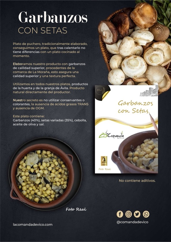 Buenos días, nuestra empresa se dedica a los productos elaborados en la quinta gama, son productos tradicionales españoles sin conservantes ni colorantes. Tienen una vida útil de 90 días si se almacenan refrigerados (0-4ºC). Nuestra línea completa la forman 8 platos, de los cuales 3 están elaborados con ternera de Ávila como ingrediente principal, y el resto son platos de legumbres tradicionales.
