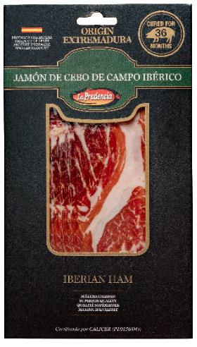 Jamón de cebo de campo Ibérico La Prudencia corte tradicional. Disponible en dos formatos individuales: 75 y 100 gramos. Nuestro formato de 100 gramos se presenta cortado a mano, por el maestro cortador.