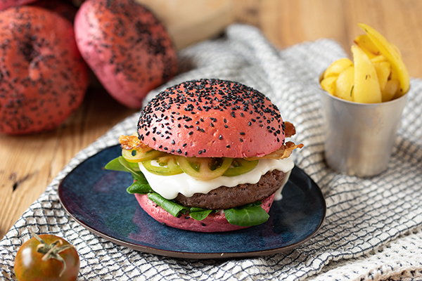 Pan de hamburguesa tipo brioche elaborada con los mejores ingredientes naturales, siendo el principal la remolacha. Todo ello acompañado por semillas de sésamo negro, lo que hace de este pan ideal para cualquier tipo de receta.
