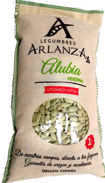 DESCRIPCIÓN:La alubia verdina, judía verde, fabina verde o faba verdina es una variedad de alubias de color poco conocida y considerada como alubia de gourmet. El grano de la alubia verdina es plano, de tamaño mediano, de color verde claro y de piel muy fina. Una vez cocinadas las alubias verdinas son de un sabor exquisito y su piel es tan fina que resulta inapreciable presentando integridad total en el grano que nunca se deshace.Hoy en día el cultivo de la faba verdina se encuentra principalmente en Burgos, Asturias y Galicia y su producción es muy pequeña. La escasez de la producción de esta alubia verde y el esfuerzo que requiere su elaboración explican el elevado precio. De todas las legumbres secas la alubia verdina es sin duda la mas cara, pero la mas apreciada por los expertos chefs.El color de su piel es debido a que la planta se arranca del suelo cuando las alubias verdinas no están totalmente maduras. En ese momento se cuelgan las plantas en un lugar oscuro y muy ventilado dejándolas secar lentamente. El color original de la alubia verdina es blanco, pero se torna a color verde transferido por la abundante sabia que aún contiene la planta.La alubia Verdina tiene la piel finísima y su textura es extraordinariamente mantecosa, lo hace que esta variedad sea ideal para los platos con mariscos. El maridaje especial que hace La alubia verdina con almejas pescados y mariscos es motivo de que se le apliquen los sobrenombres de faba do marisco, alubia del marisco y judía Galaica, aunque también son excelentes estofadas, o guisadas con caza.La faba verdina absorbe un 100% de agua con respecto a su volumen, por lo que es conveniente hidratarla para conseguir una cocción perfecta . Se aconseja poner las alubias verdinas en remojo al menos 12 horas horas antes de ser cocinadas.