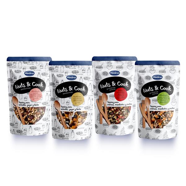 Mezclas de toppings de frutos secos, frutas desecadas y chocolate negro, dirigidos a la elaboración de desayunos y primeros platos.  Nace con el objetivo de facilitar la incorporación de ingredientes saludables a cualquier tipo de receta. Una primera línea dirigida a dos momentos de consumo clave: DESAYUNOS Y PRIMEROS PLATOS, con 4 variedades de mezclas de alimentos con propiedades saludables.