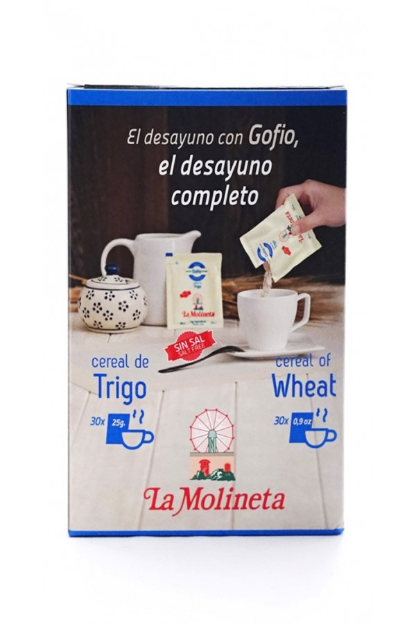 Gofio de trigo, alimento 100% natural de alto valor energético, elaborado con la mejor selección de granos no modificados genéticamente, fuente de fibras, proteínas, vitaminas (B1, B2, B3, C, D y A) y minerales (Potasio, Zinc, Hierro y Magnesio); necesarios en la dieta diaria de cualquier persona con tan solo un tazón.
