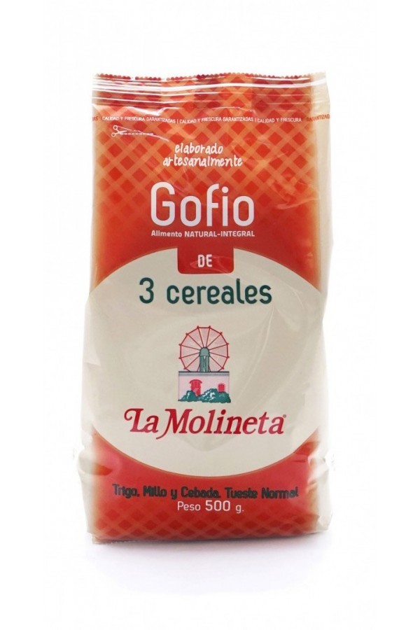 Gofio de mezcla de tres tipos de cereales que le aportan un valor nutritivo más completo. Alimento 100% natural de alto valor energético, elaborado con la mejor selección de granos no modificados genéticamente, fuente de fibras, proteínas, vitaminas (B1, B2, B3, C, D y A) y minerales (Potasio, Zinc, Hierro y Magnesio); necesarios en la dieta diaria de cualquier persona con tan solo un tazón.