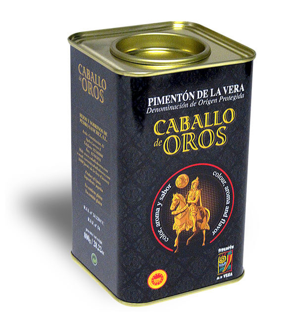 Ponemos a su disposición un pimentón de la Vera de la mayor calidad posible. Este formato de pimentón de la Vera en lata de 800 gramos es ideal para su uso en la hostelería. No obstante, también es válido para cualquier otra circunstancia.Ahora podrás darle a tus platos ese toque de sabor inconfundible que hará que se disfruten al máximo. El pimentón de la Vera Caballo de Oros es un placer gastronómico único y exclusivo, un producto Gourmet apto sólo para las mejores cocinas, como la tuya. También es un regalo ideal para cualquier familiar, amigo o conocido. Las latas de pimentón de la Vera Caballo de Oros conservan el producto en condiciones óptimas para su posterior uso, siempre que se almacene en los lugares mejores indicados para su conservación (secos, frescos y con poca luz).