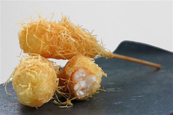 Langostino recubierto con finas hebras de pasta filo.