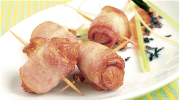 Salchicha de cerdo envuelta artesanalmente en una fina loncha de Bacon, todo ello ensartado con un palillo para degustarlo fácilmente.  Se puede regenerar tanto en horno, en plancha como frito.