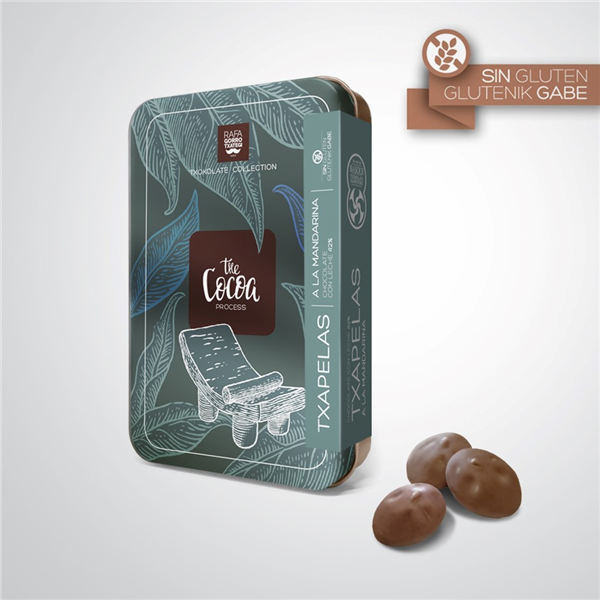 Rafa Gorrotxategi, os presenta estos chocolatitos, que elabora con forma de txapela en chocolate con leche 42% a la mandarina, junto a una preciosa colección de latas ambientadas en el mundo del chocolate.