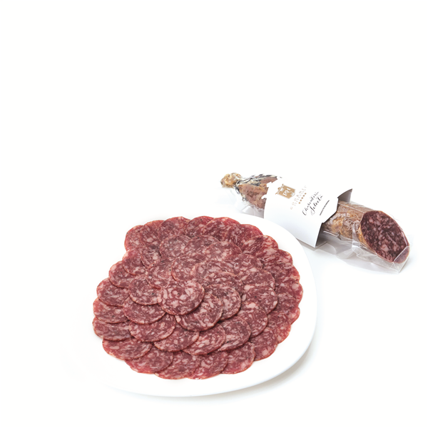 Nuestro salchichón se produce en base a la selección de los mejores magros del cerdo ibérico de la campaña de bellota, que tras ser troceados en partes gruesas para dar vistosidad al corte, se adoban con las mejores especias (pimienta, ajo, sal marina...) y se embuten en tripa natural seleccionada (cular). Maduran entre 5 y 6 meses de forma natural, dando como resultado un producto natural, de fina textura y exquisito sabor suave por sus mínimos conservantes.