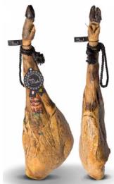 Extremidad posterior, procedente de cerdos ibéricos adultos alimentados en montanera durante 3-4 meses a base de bellotas, hierbas y rastrojos. Elaborado con el correspondiente proceso de salazón y curado-maduración natural mínima de 36 meses.