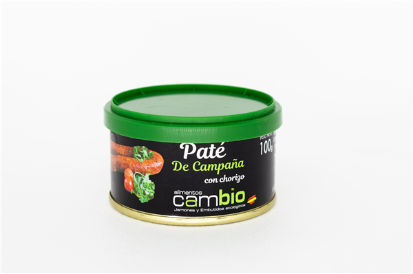 Paté Ecológico elaborado a base de hígado, tocino y chorizo, junto con otros ingrediente. Sin transgénicos, sin conservantes, sin colorantes.