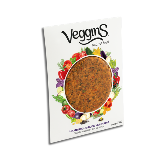 Hamburguesa vegana hecha a base de 62% de verduras frescas (tomate, pimiento rojo, calabacín, berenjena) - la hamburguesa más ligera con solo 125kCal/100g