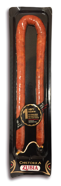 Chistorra 100% natural con pimiento choricero. Elaborada de acuerdo a los cánones tradicionales con carnes de primera calidad sin ningún aditivo artificial ni conservantes mediante un proceso de secado natural. Ganadora del XX concurso de chistorra del País Vasco celebrado en el 2015 en Donostia San Sebastián.