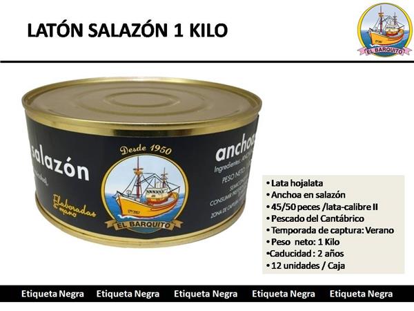 • Lata hojalata • Anchoa en salazón • 45/50 peces /lata -calibre II • Pescado del Cantábrico • Temporada de captura: Verano • Peso neto: 1 Kilo •Caducidad : 2 años • 12 unidades / Caja