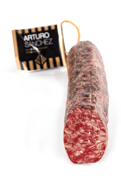 El salchichón de bellota ibérico es la expresión del carácter Arturo Sánchez, el más difícil de elaborar y un orgullo en nuestra familia. La anterior generación fue el primero en crearlo y su receta permanece guardada bajo llave. Embuchado en tripa natural de cerdo y elaborado a base de presa, pluma y secreto de cerdo ibérico de bellota de doble montanera. Su fundamento es la carne más selecta, el secado en campana con leña de encina y la curación natural durante medio año.