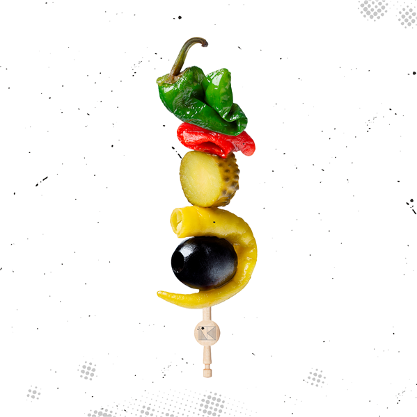 Piparra vasca encurtida, aceituna negra deshuesada aderezada con pepinillo agridulce estilo alemán, pimiento del piquillo extra y pimiento de padrón confitado.