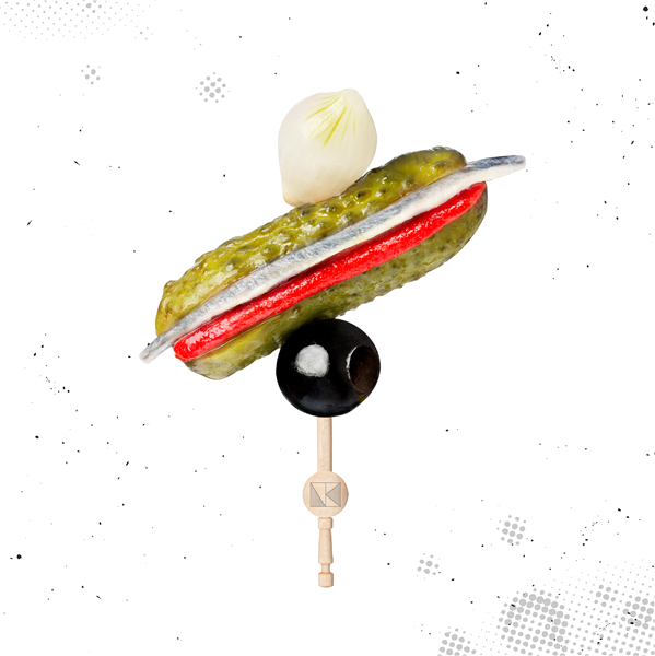 Pepinillo agridulce estilo alemán aderezado con boquerón del cantábrico en vinagre, pimiento del piquillo extra, aceituna negra deshuesada y cebollita perla encurtida.
