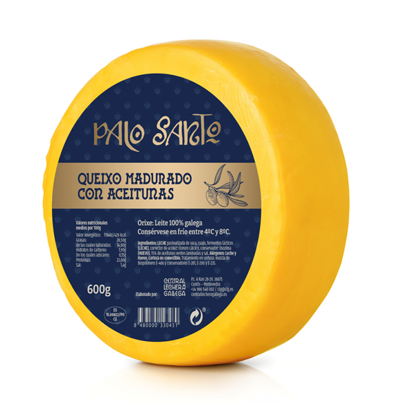 Palo Santo con aceitunas, es una fusión de nuestro queso artesanal semicurado elaborado con leche pasteurizada de vaca de Galicia y aceitunas gallegas,