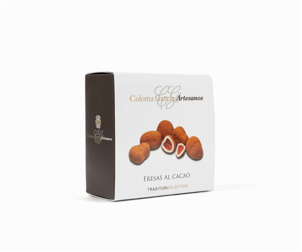 Gragea formada por un núcleo de fresa rodeada de cobertura de chocolate blanco y espolvoreado con cacao en polvo.