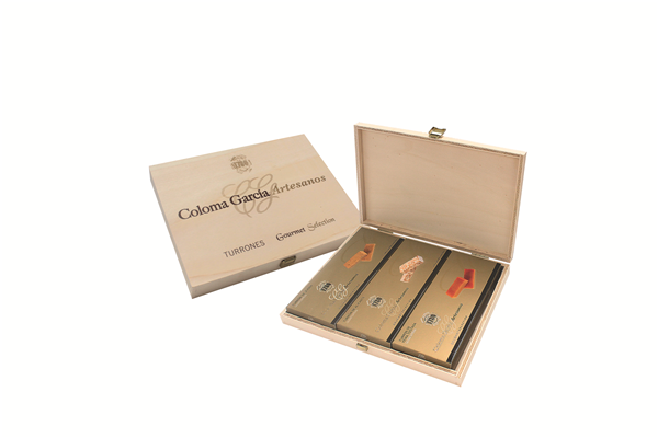 Caja de madera compuesta por 3 pastillas de turrón.