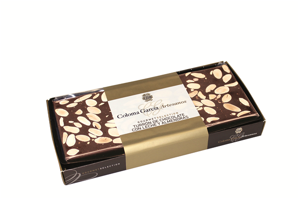 Turrón de chocolate con leche con almendras.