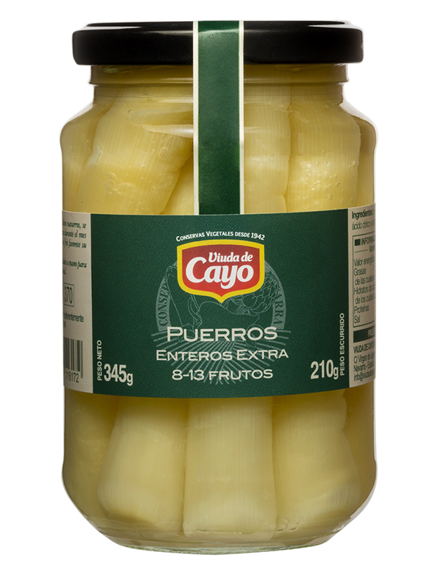 Los puerros de Viuda de Cayo proceden de cultivos navarros. Se envasan en enero, cuando el frío favorece la ternura y dulzor de esta verdura.En campo se recolectan de forma manual, realizando una primera selección por calibre. Una vez en planta de elaboración realizamos una segunda selección del producto quedándonos únicamente con los más finos. El proceso de elaboración requiere de un ligero escaldado para posteriormente pelar el producto a mano.