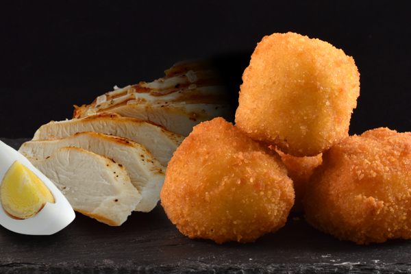 Croquetas gourmet de pollo asado con huevo. Cremosas por dentro y crujientes por fuera. Ingredientes naturales 100%: mantequilla, leche y harina.