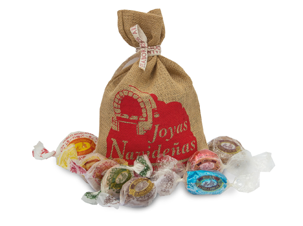 SAQUITO DE YUTE CON SURTIDO DE JOYAS NAVIDEÑAS, HECHAS A MANO Y COCIDAS EN NUESTRO HORNO DE LEÑA