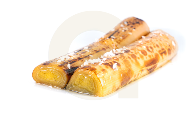 Puerro de origen nacional confitado en aceite de oliva. De textura crujiente y delicada, y sabor intenso, es muy versátil en su presentación, y queda ideal acompañado de salsa romesco.