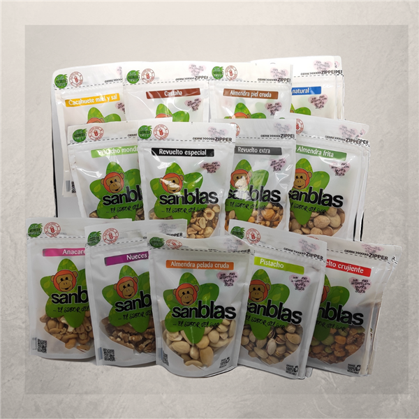 Nuestra nueva línea DOYPACK con envases de material  100% reciclable y cierre zip, en formato desde los 75-125 gr. de las referencias: almendra pelada cruda, almendra frita, almendra piel cruda, piñón natural, pistacho tostado, pistacho mondado, castaña, anacardo, cacahuete miel y sal, revuelto crujiente, revuelto especial y revuelto extra.