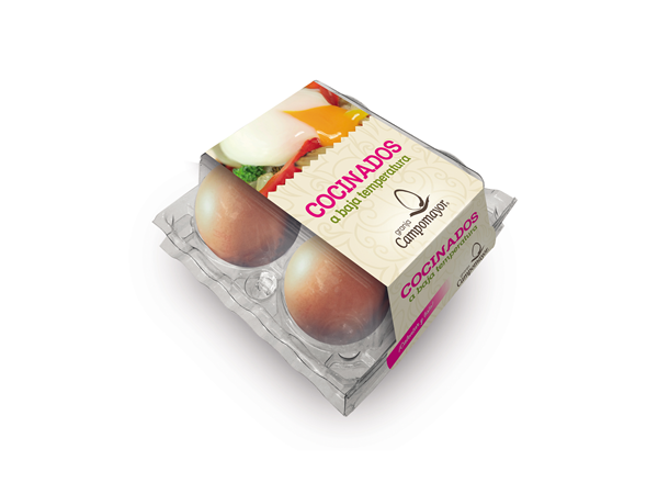 El innovador huevo a baja temperatura de Granja Campomayor se elabora con huevos procedentes de gallinas de sus granjas, de una seleccionada etapa de puesta y de un gramaje concreto. El proceso de elaboración requiere un control exhaustivo de la temperatura en todos los procesos, tanto de cocción como de enfriamiento. Es ideal para la creación de aperitivos, entrantes, platos principales, caterings..., ya que resultado es un huevo homogéneo de clara cuajada y cremosa y yema melosa. Para consumirlo tan solo hace falta regenerarlo. Basta con introducir los huevos en agua a 65º constantes durante 5 minutos. A continuación, habría que retirarlos del recipiente con agua y cascarlos para su emplatado. Este producto está disponible en formato de 4 y 30 unidades.