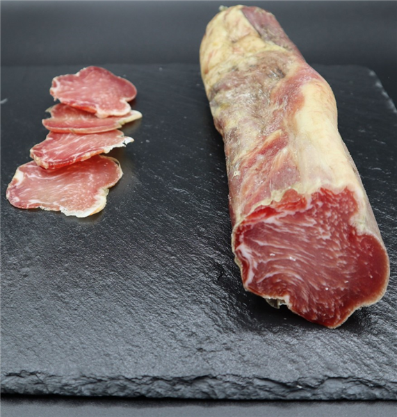 Producto elaborado con lomo procedente de nuestros cerdos ibéricos, engordados en nuestra finca puerto padrón, ubicada en el parque natural de la sierra norte de Sevilla. Curados de forma natural. La principal característica es que se trata de una caña de lomo sin pimentón, sus ingredientes son ajo nacional y sal de Cádiz. Libre de alérgenos.