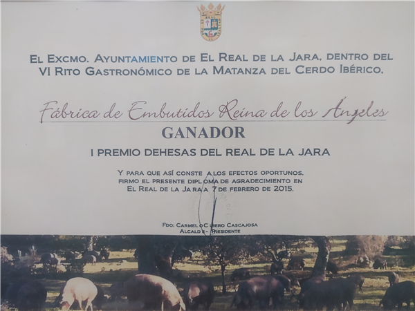NUESTRA EMPRESA IBÉRICOS REINA DE LOS ÁNGELES, RECIBIÓ EL PRIMER PREMIO AL MEJOR JAMÓN DE BELLOTA, EN EL VI RITO DE LA MATANZA DEL CERDO IBÉRICO DE EL REAL DE LA JARA, EL 07/11/2015. EN EL CONCURSO DEHESAS DE EL REAL DE LA JARA, PROMOVIDA DESDE LAS INSTITUCUINES LOCALES, DONDE PARTICIPABAN EMPRESAS A NIVEL NACIONAL.
