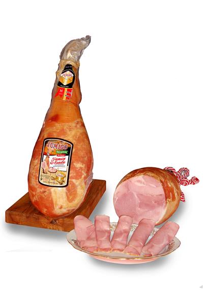Pieza de jamón cuidadosamente seleccionada, sometida a un proceso de salmuerización muy suave y un lento asado / ahumado en horno, con virutas de madera seleccionadas que le confieren un suave e intenso sabor a jamón asado.
