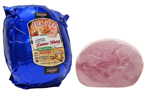 Jamón de cerdo fresco entero raza Duroc, de cerdos grasos y madurados, de carne firme, color rosada y textura fibrosa. Elaborado en un proceso artesanal muy laborioso, salmuerizado en hierbas aromáticas y especias naturales. En su proceso de cocción se realiza muy lentamente en horno al vapor. Jamón cocido natural muy saludable y de exquisito paladar.