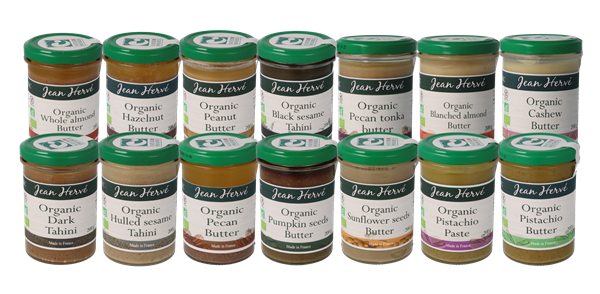 Purés y untables fabricados de manera artesanal por JEAN HERVE con frutos secos enteros y procedientes de la cosecha anual. Usamos fuego de leña para tostar nuestros frutos y molino de piedra para fabricar nuestros purés.