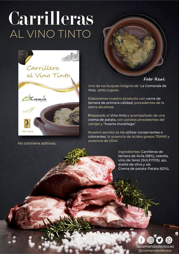 Buenos días, nuestra empresa se dedica a los productos elaborados en la quinta gama, son productos tradicionales españoles sin conservantes ni colorantes. Tienen una vida útil de 90 días si se almacenan refrigerados (0-4ºC). Nuestra línea completa la forman 8 platos, de los cuales 3 están elaborados con ternera de Ávila como ingrediente principal, y el resto son platos de legumbres tradicionales.