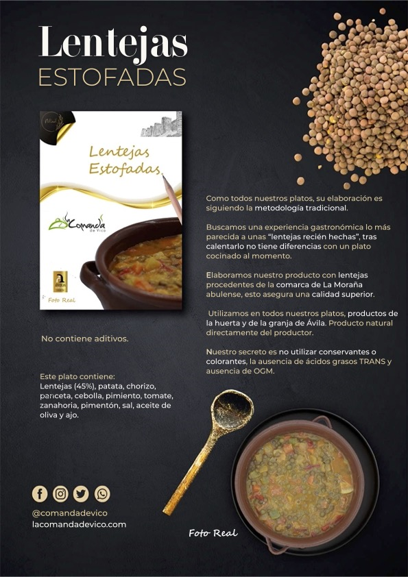 Buenos días, nuestra empresa se dedica a los productos elaborados en la quinta gama, son productos tradicionales españoles sin conservantes ni colorantes. Tienen una vida útil de 90 días si se almacenan refrigerados (0-4ºC). Nuestra línea completa la forman 8 platos, de los cuales 3 están elaborados con ternera de Ávila como ingrediente principal, y el resto son platos de legumbres tradicionales.