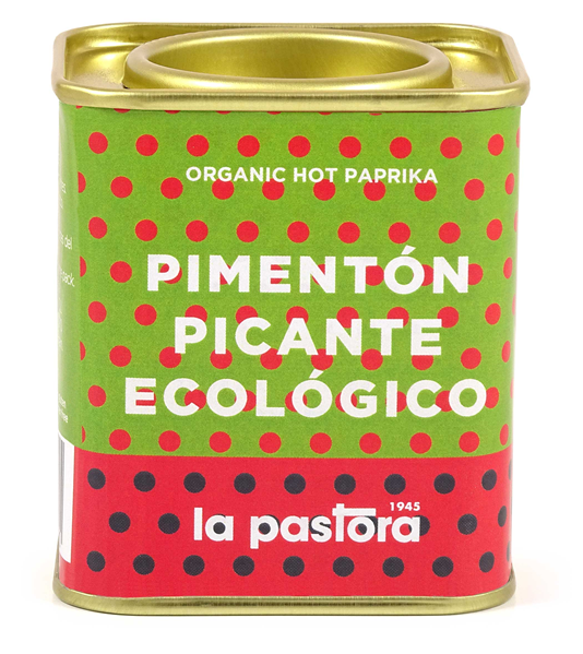 Pimentón orgánico picante, hecho con materia prima nacional de la agricultura ecológica, en lata tradicional de 75 gr, enteramente metálica, sin elementos plásticos.