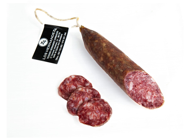 Curación lenta durante al menos 3 meses en cava natural para conseguir el mejor aroma y sabor. Piezas de cerdo ibérico, en concreto, cerdos de Extremadura especialmente seleccionados, criados y alimentados al aire libre con bellota y hierba. sal, pimienta y ajo, mezclados y tripados en tripas, que ha pasado por un proceso de maduración-secado, caracterizado por su gran equilibrio entre grasas, carnes magras y el característico aroma y sabor.