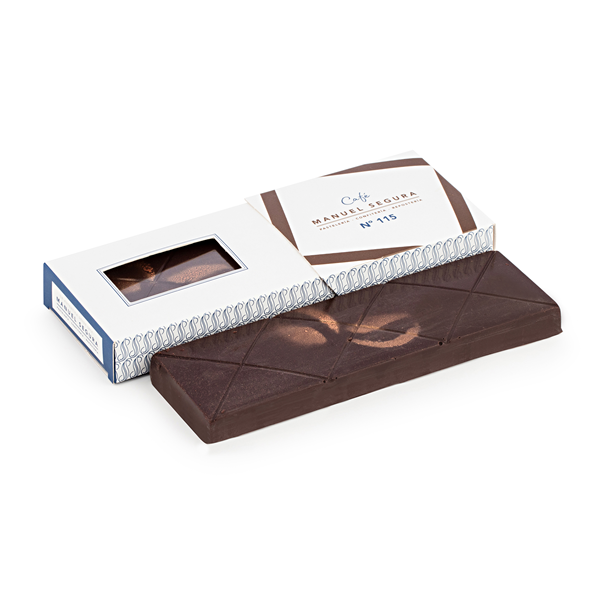 TURRÓN DE PRALINÉ CON CAFÉ: Praliné de café. Un fino praliné de almendra y chocolate negro y con leche refinado para obtener una cremosa capa de praliné y aromatizado con café molido de tueste natural, recubierto con un fino chocolate negro de 70% de cacao.