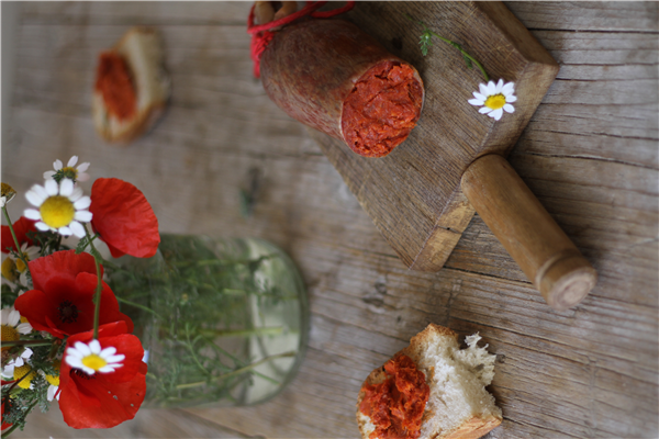 Elaboramos nuestra sobrasada de manera artesanal, utilizamos carnes de cerdo de la más alta calidad más un 40% de grasa de cerdo ibérico. Las carnes las adobamos con Pimentón de la Vera, sal y especias usamos la receta tradicional de nuestra madre, Cleo, la misma que se ha utilizado en la familia durante toda la vida, embuchada en tripa cular natural sin conservantes artificiales añadidos, sorprende por su suave aroma, tacto al paladar e intenso sabor que te transportara a tiempos pasados si tuviste la suerte de participar en alguna matanza tradicional.