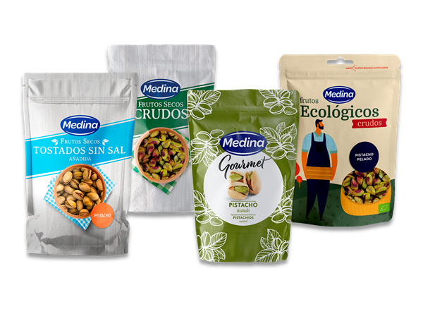 Estas características hacen que ayude a la reducción del colesterol, equilibra los niveles de azúcar, es una gran fuente de antioxidantes y tiene un gran poder saciante. Pero sin duda lo que lo hace ser uno de los más deseados es su versatilidad, que permite consumirlo como simple snack o en platos salados o dulces. Es por ello que Frutos Secos Medina cuenta con diferentes referencias de este producto para facilitar al cliente su consumo. La mayoría de ellos provenientes de Irán, con o sin cáscara, y se puede encontrar en distintas gamas de la compañía como crudo en Gama Crudos; tostado dentro su último lanzamiento de la Gama Tostados Sin sal; tostado con sal; así como dentro de la Gama Ecológica. Hace especial mención a la Gama Gourmet que sin duda, gracias a su mayor calibre, consigue un sabor y textura únicos.