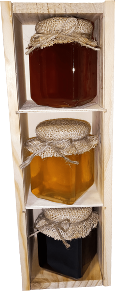 Estuche de madera que contiene 3 botes de miel de 250 gramos aproximadamente, a elegir entre las 6 variedades que tenemos (miel de mil flores, miel de aguacate, miel de tomillo, miel de romero, miel de bosque, miel de castaño).