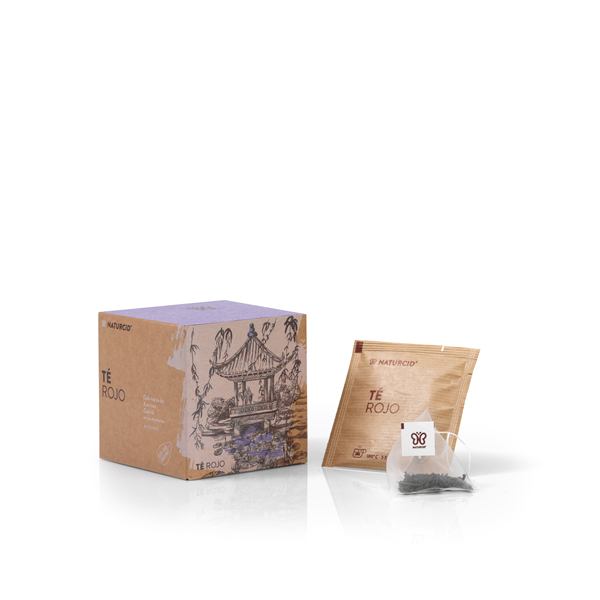 Pirámides 100% biodegradables de hojas de té rojo ecológico, envasadas en sobres individuales.